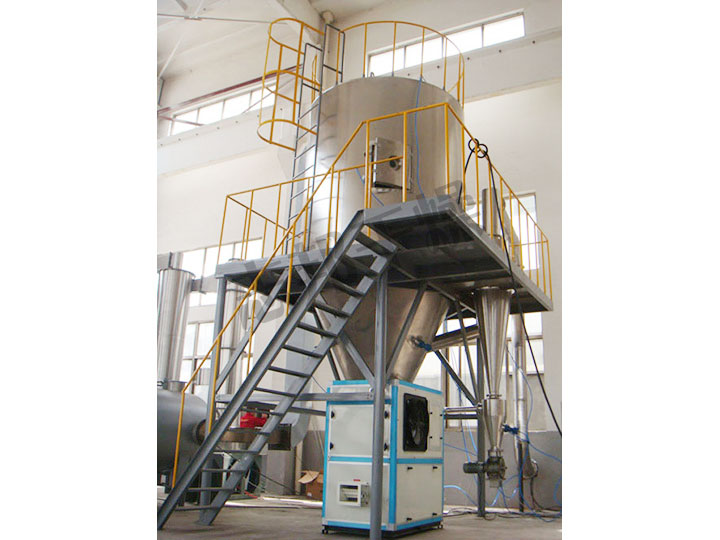 空氣經過濾和加熱,進入干燥器頂部空氣分配器,熱空氣呈螺旋狀均勻地進入干燥室。料液經塔體頂部的高速離心霧化器,(旋轉)噴霧成細微的霧狀液珠,與熱空氣并流接觸在短的時間內可干燥為成品。成品連續(xù)地由干燥塔底部和旋風分離器中輸出,廢氣由引風機排空。